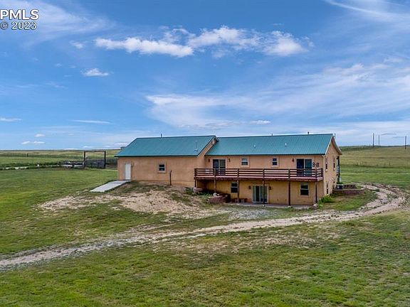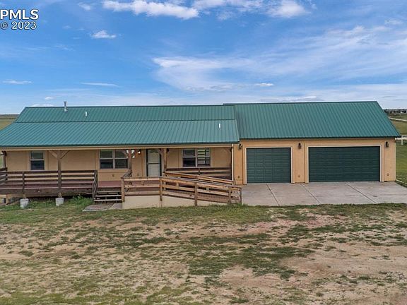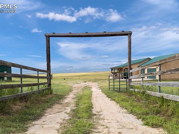 For those who cherish the serenity of rural living while staying connected to modern comforts, this property presents a unique opportunity. Welcome to your Custom Built home, built in 2008, ranch floor plan with walk out basement. Stunning open floor plan with over 2500 sq ft, 3 bedrooms, 3 bathrooms, 3 Car attached garage. Wheelchair Ramp leads you to your covered front porch with amazing eastern views. Entering into your large living room that flows into the eat in kitchen that walks out to your large back deck facing the West with priceless views of the Rocky Mountains and Pikes Peak. Master Bedroom with attached bath, walks out to the back deck over looking the back yard with covered picnic pavilion and your large shop. Walk out basement offers the 3rd bedroom with full bath attached and built in Bar, plumbed with water access. Home boasts main floor laundry room, central A/C, gas in kitchen, custom tiled walk in shower and large secondary bedrooms. Two exterior sheds: one is a bunk house with electrical and the other is perfect storage for you lawn tractor and yard tools. Large Shop(old general store) is a blank slate with endless possibilities: boasting stick built construction, forced air heating, central a/c, office, large front room, large open space with 1/2 bathroom, wash room with 3 sink compartment, and storage room. Think extra home, work shop, home school or work with Lincoln County to re-zone to your dream space! Gated and fenced 80 acres ready to be grazed by your horses, cows and llamas-This property offers a perfect blend of comfortable living and natural beauty, making it an ideal haven for those seeking tranquility and space. Schedule your Showing Today!