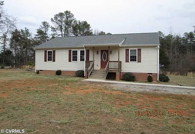 Nice Newer Ranch Home Featuring Large Living Room Bright Sunny Eat-in Kitchen, Laundry room with access from rear deck area. Master Bedroom with attached Master Bath Featuring Whirlpool tub. Two additional bedrooms on opposite side of home. Level approx 2 Acre lot close in Powhatan and 288 Access. Bank owned Foreclosure being sold as is. See attached listing attachment regarding Bank Employee disclosure that must be signed and included in offer. Must have pre approval letter from Lender that has a tri merged credit report that has been pulled. Please allow 2-3 bussiness days for response from Seller