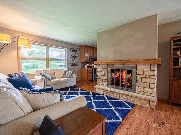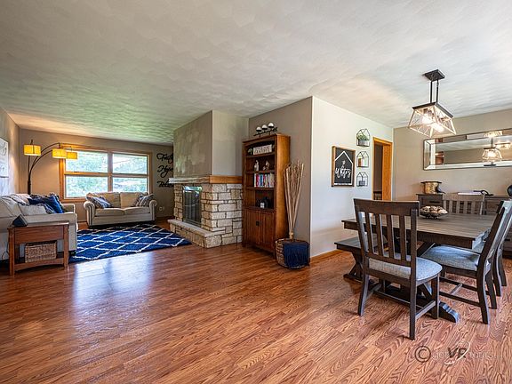As you walk through the front door of this 3 bedroom, 2.5 bath ranch, you are greeted with a formal dining room and there is a formal living room that shares a 2-sided wood fireplace with the eat-in kitchen. The master bedroom has a full bath and there are two more bedrooms on the main level along with a full bath off of the formal living room. Off of the kitchen and eat-in area there is an oversized family room that has a door that leads to the deck on the back of the house and to an above ground pool. The lower level has a large, finished space currently being used as a rec room/family room/dry bar area. The lower level also has a half bath, laundry area and room for storage. There is a door in the lower level that leads into the 2-stall garage and the backyard also has a storage shed. Some photos are virtually staged.