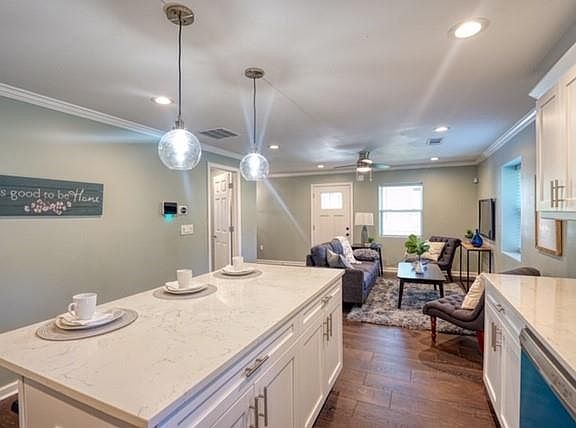 • Kitchen Features: Breakfast Bar, Eat-in Kitchen, Stone Counters, Kitchen Island, Cabinets White