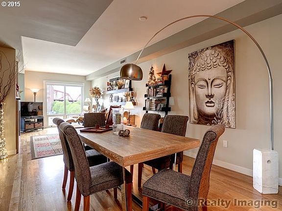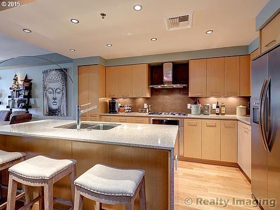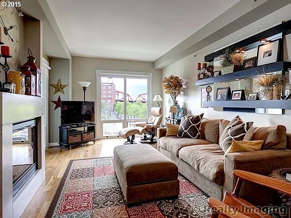Elegant building on the Willamette River. View looking South to river activity, Broadway Bridge &calming water feature below. 1BR + Den, modern features, premium kitchen appliances, cabinets & island. Wood floors, elec fireplace, remarkable closet organizers & new commercially applied paint. Separate soak tub & shower. Covered deck with new teak wood flooring is perfect on rainy days. Asko Wash/Dry, Storage Area, Common Gym & Dry Sauna.