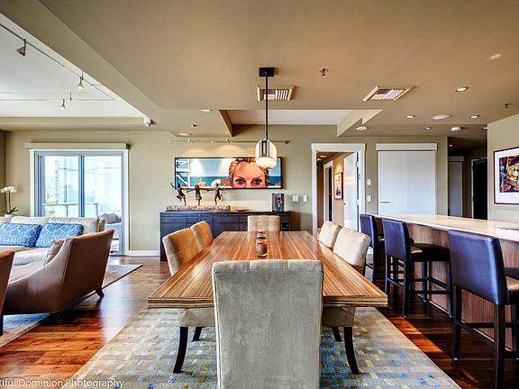 LUXE life on the river in the Pearl. Completely custom, RARE 3 BED+DEN, 3.1 BATH w/TWO huge terraces with gas hook-up. Floor-to-ceiling glass. Premium finishes include keyless entry, walnut hardwoods, remote-control shades, built-in sound system, custom built-ins, heated mstr bath flr. Gourmet kitchen features slab quartz, double-basin sink, pro appliances, built-in double ovens, 11' island . Superb construction quality with exclusive amenities such as 24/7 Concierge, the Pearl's best-equipped, largest condo Fitness center with Sauna. TWO SEPARATE parking 1-w/ Tesla charge station. Extra Storage unit included. Fab location in the heart of the city with walkable access to pubs, restaurants, shopping, groceries. BE SURE TO VIEW 3D VIRTUAL TOUR LINK BELOW