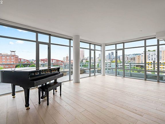 Chic & contemporary city living w/cinematic bridge, river & downtown views! New hardwood flrs, new heat pump floor to ceiling windows, wrap-around view deck & sleek kitchen great room just perfect for entertaining! Plush primary suite w/balcony & htd floors, guest suite + library/office/2nd guest space. Pre-wired for sound. A total refuge with in-building gym + sauna, 24/7 concierge, secured garage pkg w/2 spaces, storage unit. Walk the picturesque waterfront & just blocks to Pearl cafes/dining!