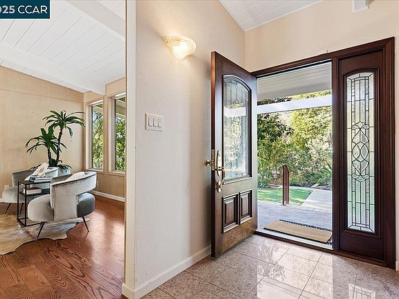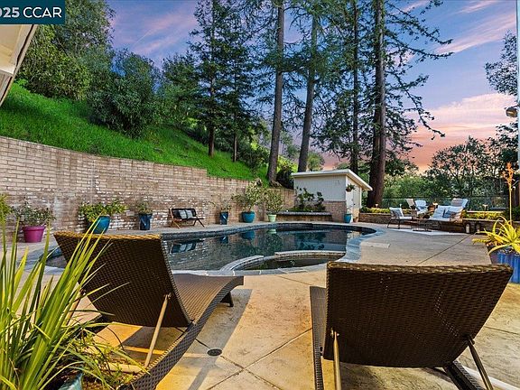 Welcome to this rarely available single-story, 4-bedroom home in Lafayette's desirable Happy Valley neighborhood. This mid-century modern gem offers serenity, comfort, and convenience. At the bottom of the street is Happy Valley Elementary, while the top leads to Briones hiking trails. The front living room features built-ins around a gas fireplace, exposed wood ceilings, and large windows that flood the space with natural light. The thoughtfully designed kitchen boasts abundant cabinetry, high-end appliances like a Sub-Zero fridge Thermador range, a large island with a sink, and skylights. One of the home's best features is the den and bonus room—ideal as an in-law suite or private guest space. All bathrooms were recently remodeled, including the spa-like primary suite with a soaking tub and grand stall shower. Step outside to your private oasis with a heated pool, spa, gas fire pit, and stunning hillside views. Leased solar, central heat, and A/C add efficiency. Located near Hwy 24, top-rated schools, and downtown Lafayette’s iconic shops and restaurants, this home is truly magical.