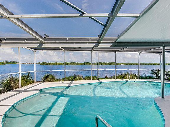 Unique & Rare Opportunity! Spectacular panoramic views of the river & wild islands. 170 feet seawall, private dock with deck, water is 4 feet deep, 2 new boat lift motors, easy access to the Barge Canal & out to the Ocean. Kick back & relax in your private screened sparkling pool with amazing natural scenery, watch the dolphins, manatees & the beautiful birds. Kitchen and baths all have granite counter tops. Meticulously cared for 3 bedroom, 2 bath, Florida room, well-appointed kitchenn& 2 cargarage has room for your boat or camper plus 2 storage sheds. Backyard is impr3essive sweep with lush, mature landscaping including 10 different species of palm trees. Home is located at the end of a cul-de-sac. Safe place to bring up the kids & a great school district. Working on the Space coast? This is your piece of paradise come & bring your new boat, jet skis. Great home for water sports, fishing, nature watching, & sunsets. See the next rocket launch. Make an appt today.