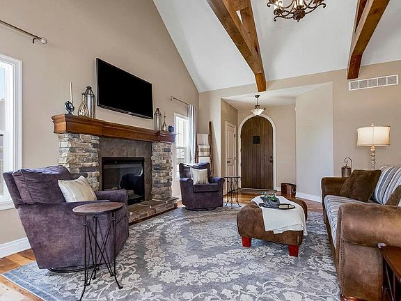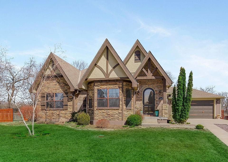 Stunning Troy Bellah true ranch style Tudor with custom finishes and nestled on a quarter acre that backs to nature! Tired of the cookie cutter homes? This one-of-a-kind home shows like no other with stunning features throughout! As you first enter, you will be WOWed by the large custom arched wood and storm doors. Great room has tall, vaulted ceilings and wood beams. Open kitchen with granite counters, center island, and large walk-in pantry. Dining area off the kitchen with access to backyard. Master Suite includes a nice sitting area with built-in cabinet and private spa-like bath with soaker tub, glass shower, and walk-in closet. Two additional bedrooms upstairs and tiled hall bath with shower/tub. New carpet upstairs! Lower level recently finished with true 4th bedroom with walk-in closet and egress window. Lower level full bath with tile and shower. Entertain or enjoy family time in the downstairs family room which includes a fireplace, built-in speakers, granite wet bar, and barn door. Bar includes fridge/freezer with ice maker, dishwasher, microwave, and sink with disposal! There is plenty of storage in the basement as well! Large stamped patio & expanded patio and backyard has a picket fence with custom iron gates, extensive professional landscaping, and fish pond! Storage shed and in-ground sprinklers to boot! Home includes 23 panel solar array by Wentz Solar with monitoring system! Garage includes 50 amp wiring and outlet installed for electric car charging. Home exterior was repainted in 2020! This breathtaking home is nestled on a cul-de-sac with a HUGE private lot! See it today!