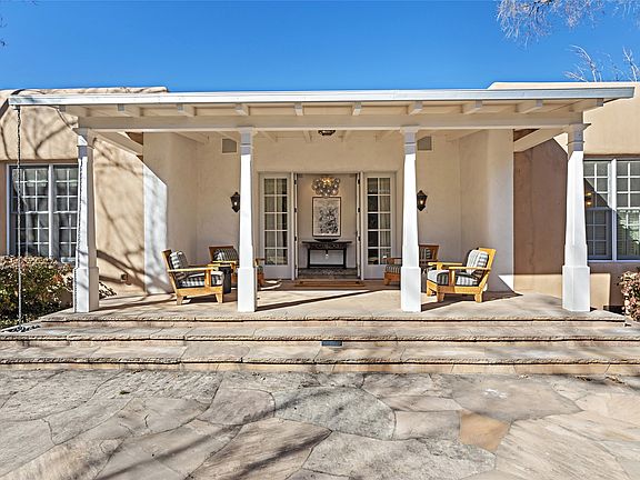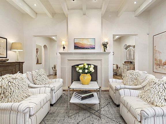 This elegant, hilltop estate, located on the Historic Eastside, offers glorious views of the Jemez and Sangre de Cristo mountains. The pueblo style home and guest house are appointed with territorial-style influences of clean lines, high ceilings, and classic features. The private, gated retreat provides a sophisticated, park-like environment to enjoy the understated beauty of quality luxury finishes throughout. The main residence offers an inviting living room with large cast stone fireplace and adjoining sitting room; and a well-appointed chef’s kitchen with access to outside entertaining spaces, including a wood-burning kiva fireplace and grill. The romantic primary suite has a beautiful fireplace, two sets of French doors to a balcony to take in the beautiful surroundings, and a spa-inspired bath. Generously proportioned rooms feature diamond plaster walls and varying widths of handsome reclaimed oak plank floors. The guest house will delight with finishes consistent with the main residence: a cozy living area with fireplace, open to the beautiful chef’s kitchen; its own primary and guest bedrooms; and lovely outdoor spaces to take in big views of the Jemez mountains and sunsets. The completely enclosed compound has mature gardens, gorgeous hardscape, Aspen groves, and numerous outside spaces to enjoy. This is an exceptional property in a premier location that includes a 3-car garage.