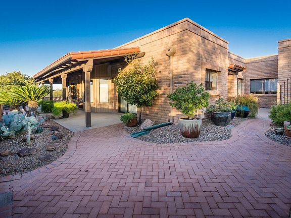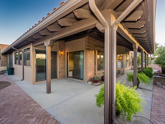Territorial facade with easy care mature landscaping sitting on a ridge above the new Canoa Hills Park providing immense privacy while enjoying the open space below this home. Gorgeous sunsets to the west and plenty of shade in the warm months on the wrap around porch. The oversized garage accommodates larger vehicles measuring approx 24 x 24. This sought after Vera Cruz model offers 2 bedrooms in a split floor plan AND a large den with pocket doors located off the kitchen and great room. The interior is adorned through out with solid knotty Alder wood doors and a perfect mix of Saltillo tile and wood laminate flooring against warm southwest wall colors. Beautiful updated Hickory cabinets, light fixtures, plumbing fixtures, Talavera sinks and a huge walk in shower describe the baths. The kitchen touts knotty Hickory cabinets with generous storage, soft close drawers and soft close roll outs, 2 lazy susans, cookie pan storage, a pantry cabinet, and display shelves on either side of a deep sink with a south facing window above it. Ceramic tile counter tops and back splash match the island created when the kitchen was remodeled to open up into the dining area situated in the great room where a gas log fireplace is at the far wall with sliding doors on either side. The open concept makes this a fantastic home for entertaining along with the wet bar alcove being convenient to the kitchen, great room and den. Wrap around patios are easily accessed from the kitchen and great room. A partial enclosure of the back porch was the seller's art studio and now awaits the next owner's preference for use which may be a craft, hobby, sewing, library room or just a sitting area to enjoy the open skies and desert below.