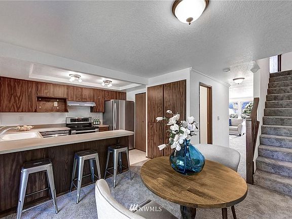 Welcome to this Beautiful corner unit Town Home Private w/tons of natural light. New windows, New interior paint, new carpet thru out. Huge master up w/ .75 ba & slider to private balcony. 2nd bed a Jr suite up very spacious w/own full bath. Kitchen-new ss appliances,eating bar, tons of counter space & storage, opens to dining w/slider & private patio w/ court yard access, new w/h. Clubhouse, work out rm, outdoor pool, hot tub. 2 pkg spaces out front, 1 covered. EZ commute I-5,transit, shopping.
