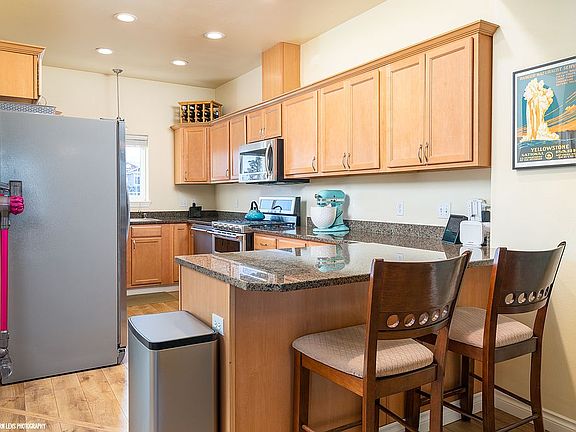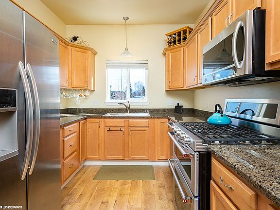 South Anchorage home located within walking distance to daycare, parks, restaurants, bars, numerous strip malls, and grocery store. End unit duplex backing onto a forested vacant lot with an extra large driveway. Home features granite surfaces throughout, SS KitchenAid appliances, laminate flooring, solid oak stairs, modern tile, new carpet, exterior and interior recently paint, updated light fixtures/ceiling fans, new blackout blinds in bedrooms, and a dry bar. Home also has a rare 800 square foot finished garage with LED lighting.