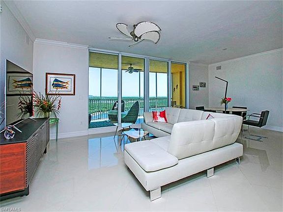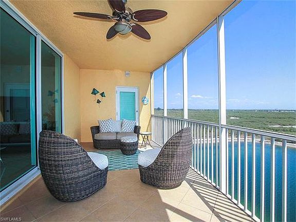 Stunning, completely updated condo - would fit into the pages of Architectural Digest. Secured elevator lifts you to a private foyer opening to a spacious great rm w/porcelain floors, crown molding. A wall of sliders showcase the panoramic view over a 25-acre lake, preserve, the Bay & Gulf. The lights of FMB & Sanibel provide an equally beautiful night view. A 300 sq ft. screened outdoor living area expands the great rm further. A lg kit. w/granite, coordinating backsplash, SS appliances, walk-in pantry. MBDRM w/walk-in closet & en-suite BA. Split plan w/2 guest bedrms & guest BA. Lg. laundry w/deep sink. A cabana being sold w/condo for an additional $85,000 & $491/quarter; furnished with exceptions. 2 under bldg. parking spaces & extra storage included. 5-star amenities: 6000 sq ft club. -fitness/aerobic rms; billiards; media rm; entertaining kit. dining/living. Resort style pool/spa. Tennis/Pickleball courts. Mile long walking trail. Walk to the beach. Bike to FMB & Sanibel.