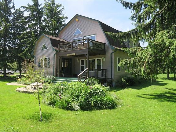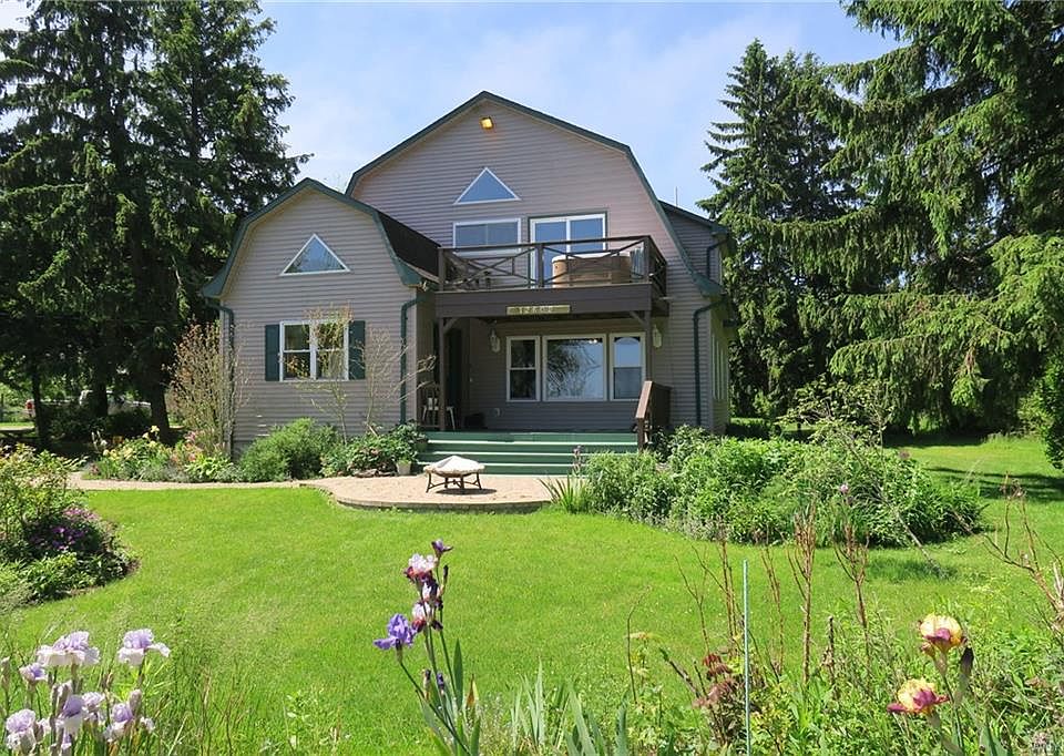 Wow, expect the unexpected! Spacious, open floor plan with so much to offer! 1st floor has 2 Bedrooms, Office, Laundry room, Kitchen, Living room, Dining room and Full Bath. Open staircase to 2nd floor with a large vaulted Family Room plus Bedroom and brand new dream Bath with tile and glass shower, jet tub, and skylight. Sliding door off the great room to a balcony with fabulous views of Lake Ontario. Home features Honduras mahogany floors throughout, in-floor radiant heat, paver sidewalk and patio, large deck. All this plus a 2 story 24x32 Garage with roughed in bath upstairs ready for finishing. 4 foot basement insulated with spray foam. 1.5 Acres, beautiful gardens. Fenced area for garden could be a dog run. Deeded Lake Access is directly across the street! New septic 2010!