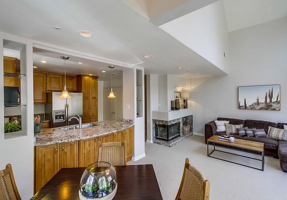 Beautiful sunny upper end unit with dramatic west-facing arched window views. Interior location in the complex with no traffic noise yet close to community pool, spa, and gym. Two upstairs masters with vaulted ceilings and ensuite bathrooms. New carpet, fresh paint, brand new A/C unit. Clean and ready for new buyer. Large view patio w/cool breezes. 2 c tandem garage. Just blocks to shops, restaurants and schools with an unusually high "walk score" of 75!