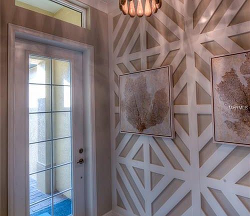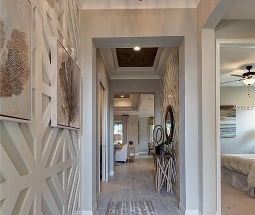 - Interior Features: Ceiling Fans(s), High Ceiling(s), Master Bedroom Downstairs, Split Bedroom, Crown Molding, Window Treatments, Open Floorplan, Solid Surface Counters, Solid Wood Cabinets, Kitchen/Family Room Combo, Tray Ceiling(s), In Wall Pest System, Thermostat, Pest Guard System