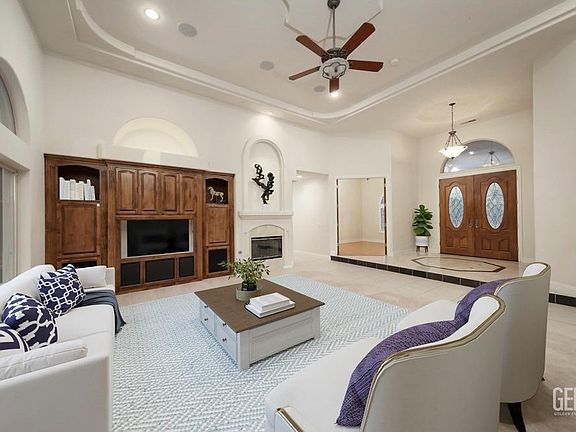This stunning four-bedroom, two-bathroom home in the upscale gated community of Trinity in Northwest Bakersfield is truly incredible. Upon entering the front double doors, your eyes are immediately drawn to the tropical paradise of a backyard. After the initial excitement of the first look, you'll notice the towering tray ceilings and custom details throughout this luxurious home. The wide-open, split-wing floor plan includes a spacious kitchen with a center island, a formal dining room, and a cozy fireplace in the living room . It also has surround sound and tons of storage throughout the home. The master bedroom is exceptionally large, featuring a walk-in closet to die for. The bathroom boasts a jetted tub, dual vanities, and plenty of room. This generously sized lot includes a fenced pool with sheer descent waterfalls, an inviting pergola, a fountain, and is surrounded by block walls. The three-car garage is very spacious, offering extra storage and attic access.