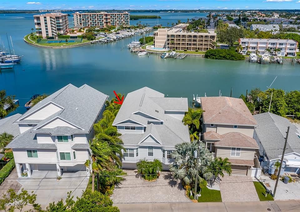 The beach life awaits! Have you ever dreamed about waking up in your own waterfront beach house and enjoying Florida's balmy breezes while having coffee and watching the dolphins play or strolling miles of white sand beaches while viewing spectacular sunsets every night? Now is your chance! This impeccably maintained beautiful Key West inspired waterfront pool home is ideally located steps from Treasure Island's pristine sand beaches and just a few blocks from famous John's Pass Boardwalk and is one of the best buys on the beach! This impeccable home will have A BRAND NEW 20 YEAR SHINGLE ROOF WITH TRANSFERRABLE WARRANTY INSTALLED MID MARCH! Built by Paul Skipper, this well built 3 bedroom (plus 2 offices) beach house offers an expansive layout, lots of windows for abundant natural light and volume ceilings throughout as well as small backyard beach area, a large composite dock with 10,000lb lift and 2 new Trane 17 seer AC units. The first living level hosts a light and bright kitchen featuring the modern look of flat panel white cabinetry, granite countertops, (new Viking stainless steel refrigerator, dishwasher and wine refrigerator) a cooking island with Jenn Air cooktop and grill insert, built in desk, closet pantry and breakfast bar overlooking the waterfront dining area and family room which flows seamlessly to the expansive newly remodeled covered deck (27'4"X9") finished with low maintenance composite wood grain material. Also on the main level are two spacious bedrooms with lots of closet space that share a fabulous bath with tub shower, a large den (an excellent location for a home office or 4th bedroom) and gorgeous hardwood flooring throughout the living areas and bedrooms. The top floor boasts an enormous Primary suite with high ceilings, gorgeous hardwood flooring, 2 very large walk-in closets, a fabulous en-suite bath with dual vanities, jetted tub with separate shower and water closet. Additionally the top floor hosts the laundry room and another office (ideal for a play room or nursery) as well as a 2nd large waterfront deck (23ftX10ft) also newly remodeled with low maintenance composite. There is ample room for all of your toys in the large 4 car garage with built-in storage closets and work benches and extra room for much more including high garage ceilings which are perfect for those who wish to have additional cars on lifts! The fabulous backyard features brick pavers, an outdoor shower and pebble tech interior pool surrounded by mature tropical landscape...you will feel like you live on vacation year round! (Floor plan available)