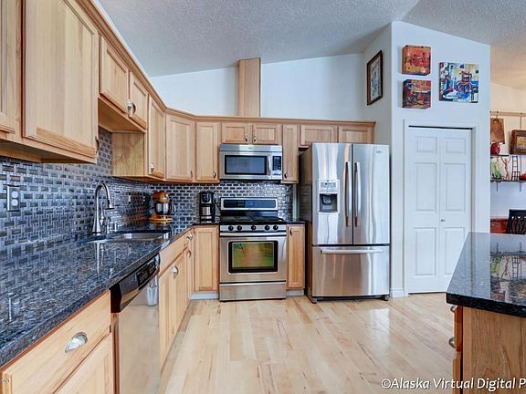 Beautiful Ranch style home on nearly 1/2 acre lot. Plenty of parking for your Alaskan toys. Open floor concept with kitchen island, wide hallways, all granite counter tops including bathrooms. Beautifully finished metal back-splash, SS appliances & pantry. Gas fireplace, built-in shelves & closet organizers. 5 Star Energy Rated, humidity control, on demand hot water heater & water softener. The two car garage is HUGE, with two big windows a man door and plenty of space for storage or tool boxes. Come tour this home today!