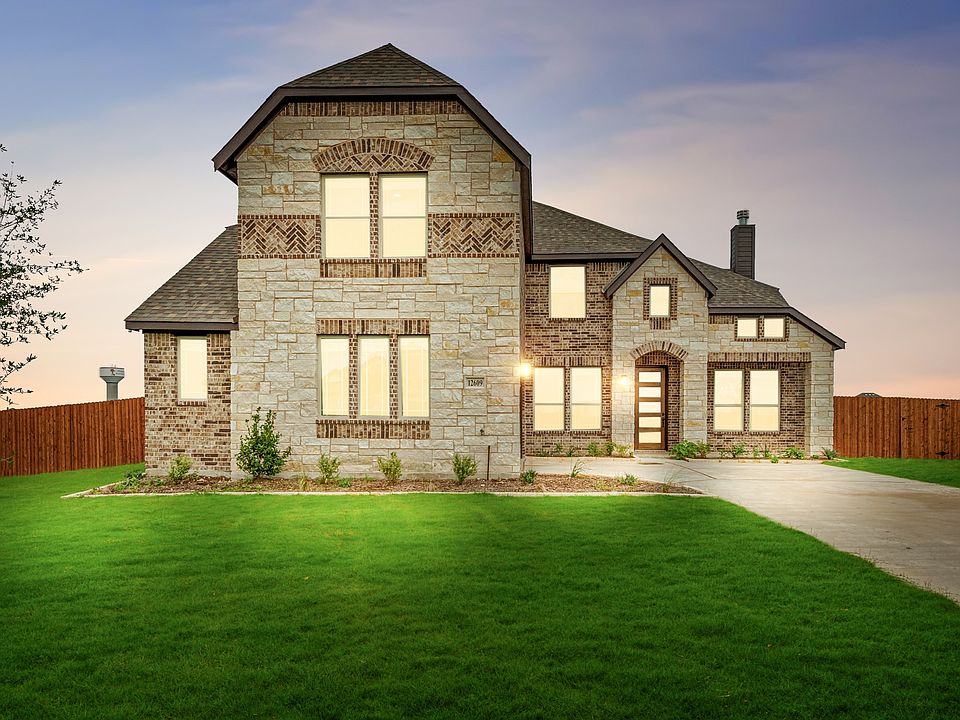 *Ready for Move In Day* Breathtaking stone J-swing on over a half acre! The Spring Cress plan from Bloomfield hosts 5 bdrms, 4 baths, a spacious Study, Formal Dining, and upstairs Game room. This home features beautiful Laminate Wood flooring in downstairs common areas, and the Family Room packs a dramatic punch! 18ft Stone Fireplace reaches the soaring ceiling, with extra iron spindling at the Game room overlook above. Primary Suite & guest room with neighboring full bath located on the 1st floor; 3 large bdrms upstairs. Sparkling Quartz countertops and Painted Cabinets grace the kitchen, all baths, and utility room. California Island Kitchen made for hosting with built-in SS appliances, wood vent hood, trash can pull out by the sink, and a frosted glass pantry door. Custom 8' Front Door, storage & mud bench in the utility, Glass French Doors at the Study, Gutters, Sprinkler System, Fully Sodded Yard, Stained Fencing, and more! Stop by Bloomfield's model in Coyote Crossing today.