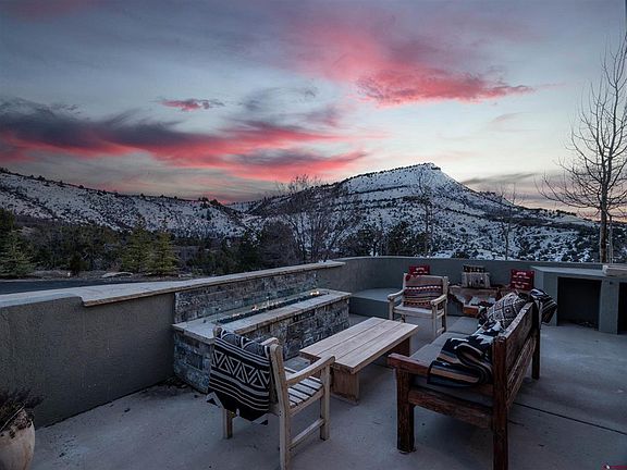 Elegance and thoughtful detail abound in this classic southwest Colorado home. Set back from the road and situated among 39+/- acres of juniper and pinion woodlands, the homesite offers sweeping views of the La Plata Mountains with maximum visual privacy. Ascend the curved stone steps to an entryway that opens into an elegant great room and kitchen area. This spacious central room with tumbled travertine floors and twelve foot ceilings provides an inviting and warm space for easy entertaining and everyday living. The handsome stone fireplace and mantle features custom masonry, reclaimed oak, large gas logs, and a custom steel fire screen and mantle supports created by a local artisan blacksmith. Mountain views are prominent throughout this main room as new picture windows plus a custom steel and glass doorway by Schiavone Woodworking were added to maximize light and views. The thoughtfully designed kitchen area works great for everyday use and delivers optimal function and style for parties and entertaining. Details include a Lacanche French range with six burners, griddle, grill, French eye, custom commercial venting system, and three ovens (2 electric/1 gas). The kitchen also has a microwave drawer, stainless 48-bottle wine cooler, stainless Sub-Zero glass-front refrigerator, single-slab granite countertops and a large island with bar seating and stainless sink. There's also a cozy breakfast niche with window seating surrounded by large windows framing incredible mountain views. A separate freezer-fridge provides extra storage. The formal dining room provides an enchanting dining environment with 10' ceilings, chandeliers, cream linen curtains and custom lighting. The private sitting room located near the two guest suites creates a warm atmosphere for quiet conversation. This bonus living space is filled with natural light by the newly installed picture windows lending dramatic views of the surrounding hills and rocky cliffs. A cozy gas fireplace is framed by a lovely mantle with granite accents and built in book cases. The beautiful powder room was renovated in 2022 with Phillip Jeffries wallpaper, custom wooden vanity, contemporary formed concrete sink and sconce lighting. Down the corridor on the opposite end from the guest suites is the private master bedroom suite. This spacious retreat includes a gas fireplace with an antique cypress mantle from New Orleans and two large walk-in closets. The master suite boasts gorgeous views of the scenic surroundings via picture windows on the north and french doors leading to the north deck. The luxurious master bath has seamless granite counter tops, walk-in steam shower with three waterfall shower heads, built-in corner bench and separate deep-soak bathtub. Each guest bedroom features en-suite bathrooms. The first guest bedroom has 10’ ceilings with two closets. This bathroom has shower tub/combo with travertine tile counters, Kohler porcelain sinks, and bronze fixtures. Guest bedroom two also has a large walk-in closet with rear deck access and beautiful views of the La Platas. The en-suite bathroom has a porcelain Kohler under-mount sink, walk-in shower with a built-in bench and waterfall shower head. The owners added air conditioning in early 2024. Many improvements for outdoor enjoyment including a stucco and stone front patio with built-in seating and serving shelf. This appealing feature can be used throughout the day. Evening use is made comfortable with a 72-inch custom stone masonry ribbon fireplace with glass wind screen. Over 25 trees including fir, pine, spruce and aspen have been added along with establishing perennial beds with flowers, roses and shrubs to attract summer butterflies and hummingbirds. The entire area surrounding the house outside of the beds has been seeded for local grasses. A new asphalt driveway was completed in '21 and seal coated in 2022. The heated 864 square ft 3-car garage provides warmth and extra storage. 15 minutes to Durango!
