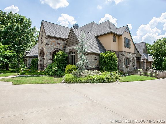This English country house built by Brian Wiggs is located in gated Oak Hill of Jenks which backs up to Five Oaks Ranch The outdoor living rm & kitchen areas overlook the stocked pond Ground floor features a wood paneled office formal dining room w/ vaulted ceiling den w/ 16+ ft tall beamed ceiling & stone fireplace The kitchen has quality Thermador appliances granite counters & walk-in pantry This house is located within the new Bixby West Elementary School Area 2 adjoining lots are also available!