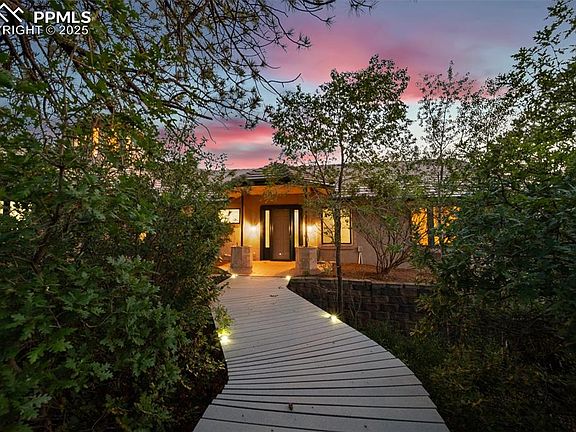 This one-of-a-kind custom walk-out rancher is positioned to maximize some of the most stunning views of Pikes Peak perfecting positioned on a private 5.12 acre lot in Bridle Bit Ranch * Nestled in the Pines and designed with exceptional craftsmanship, this one owner home is loaded with style * Offering a seamless blend of comfort and functionality, this home is ready for your creative eye as some updating is needed * The main level showcases travertine, hardwood and tile flooring throughout, anchored by a dramatic radius great room with a wall of windows that flood the space with natural light and the most AMAZING Pikes Peak views * A dual-sided fireplace connects the great room to the formal dining area, complete with a full wet bar, perfect for gatherings and entertaining * The gourmet kitchen is outfitted with granite countertops, a 6-burner Dacor range, double ovens, raised dishwasher, appliance garages and a spacious walk-in pantry * Richly appointed library offers a steel, spiral staircase leading to the “Eagle’s Nest,” a truly unique space with incredible panoramic views, ideal for quiet reflection or creative inspiration * The luxurious primary suite features a spa-like bath, seamless corner window with massive views, walk-in closet and direct access to a large laundry/craft room * The walk-out lower level includes a spacious family room, second wet bar with solid stone counters, dishwasher and beverage fridge, plus two additional bedrooms with a Jack-and-Jill bath, an exercise room, and potential for a fifth bedroom * The enormous workshop includes garage door access to an additional oversized 2-car garage—perfect for car enthusiast | hobbyists or storage * Radiant in-floor heating throughout, Pella triple-pane windows and high ceilings to create plenty of custom appeal and drama * Oversized 4 Car Garage, WOW * Exciting tile floored decking enhances your outdoor living experience * This is a truly special home that must be experienced in person * Look Now!
