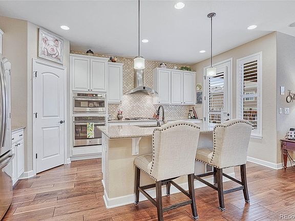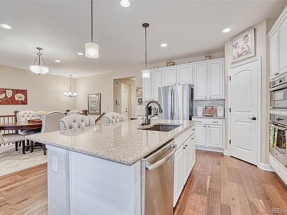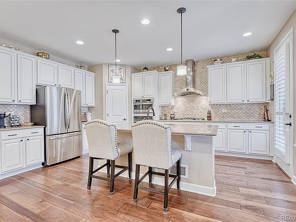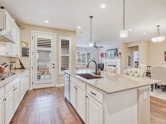 Beautiful upgrades throughout this well maintained, newer built, one owner, ranch style home. Open floor plan includes a gourmet kitchen with a large island, slab quartz counter tops, stunning stone back splash, stainless steel appliances, and a 5 burner gas cooktop. Other amenities include 9' ceilings, a tasteful gas fireplace & surround, hardwood floors, plantation shutters, & built-in speakers. Sizable primary bedroom includes upgraded carpet, crown molding, walk-in closet, and a 5 piece bathroom with upgraded finishes as well. Low maintenance yard has been professionally landscaped to include a gas fire pit, privacy fence, front & back sprinkler system, and a covered patio. Property also boasts a full unfinished basement with a good layout for a custom finish, radon mitigation system, humidifier, epoxy garage floor, cement tile roof, and central A/C. Conveniently located near Lincoln and Peoria Rd. Minutes from I-25, DTC, Meridian Business Park, Park Meadows Mall, schools, shops, & hospitals.