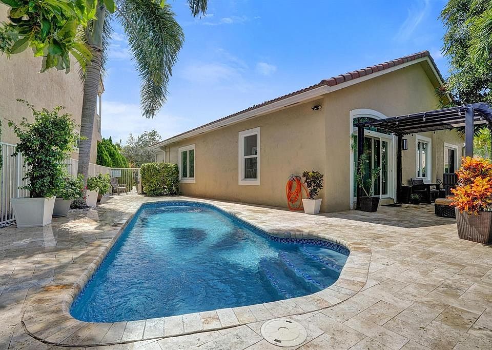 Modern glass backsplashHeated poolFreshly painted interiorWhite quartz countertopsNew water filter systemNew modern hardwareVaulted ceilings
