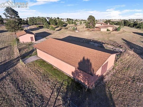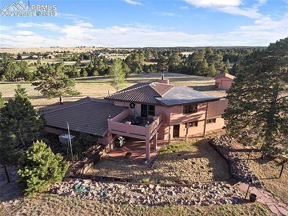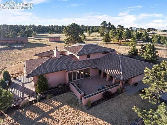 Exceptional equestrian estate on almost 10 acres of trees, meadow and mountain views. Beautiful custom home in a sought after equestrian community! High end 60x36 stucco barn with 4 custom 15x12 stalls, multiple tack and feed rooms, water, electric and the barn is plumbed for a bathroom and hot water heater. 30x20 RV garage with 2 overhead doors and electric. Secondary 30x20 garage/workshop with electric. Fully custom home with over 4,000 square feet above ground perfectly placed for maximum privacy with a high end Spanish tile roof, low maintenance stucco and brick exterior, 6 car garage and multiple outbuildings. The open and welcoming floor plan is bright and open with spacious room sizes and soaring vaulted ceilings. The great room is large with floor to ceiling windows to take in the gorgeous views, multiple walk-out locations to different outdoor entertaining spaces, wet bar, 22x7 sunroom and a stately four sided gas fireplace and custom vent. Open concept kitchen with an abundance of high quality solid wood cabinetry w/ roll-out shelves, 6 burner gas Jenn-Air cook-top, trash compactor, island, double ovens and a pantry. This home was designed with outdoor entertaining in mind with 4 patios and a private master deck. Private and luxurious master suite with sitting area, huge walk-in closet, 5-piece master bath with jetted tub, huge double vanity and private master deck overlooking the trees and meadow of the estate. The home, grounds and outbuildings have been meticulously maintained and are superior in quality. Fantastic access to Colorado Springs and Falcon. The community has multiple riding trails and a equine facility. Domestic well. No HOA.