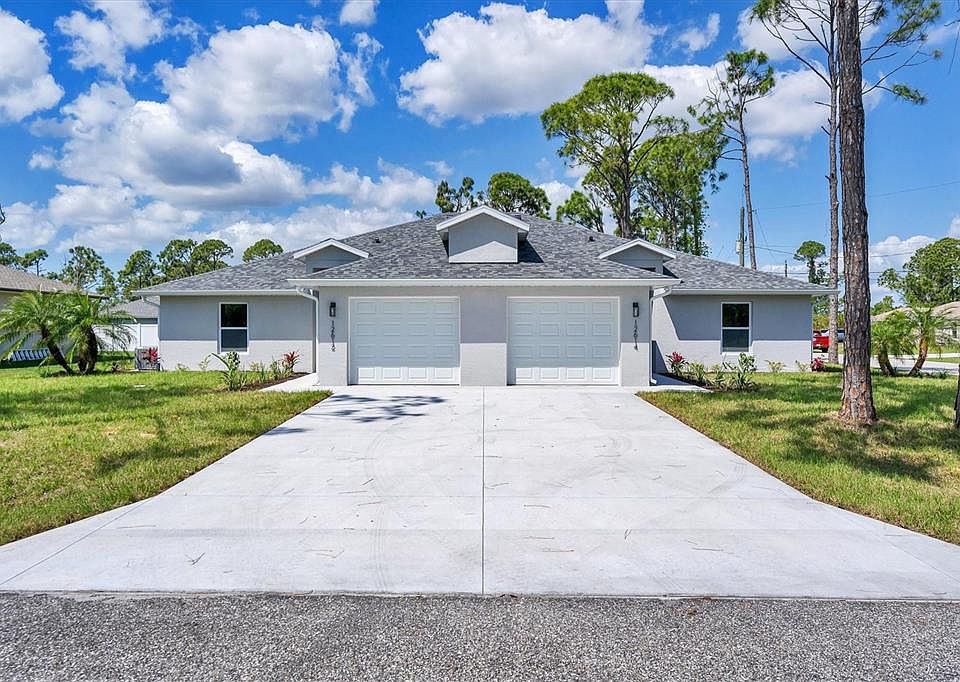 This BRAND-NEW Duplex is an extraordinary investment opportunity to acquire in a highly sought-after location. Suitable for anyone who wants to occupy one unit, whether full time or as a second home, while generating full-time income renting out the other side. Also, if you are looking to keep your family together with two living spaces this would be ideal. And lastly, for the investor, this would be perfect in your investment portfolio to generate rental income. Located in the community of Port Charlotte, this meticulously planned residence is guaranteed to impress with its unique features and customized design. Positioned on an oversized, corner lot, each duplex has 3-bedrooms and 2-bathrooms, oversized with more than 1,400 square feet of living space per unit, covered back porch and extra deep one-car garage. Upon entering the home, you will be immediately impressed by the open floorplan and design details. You’ll enjoy cooking and entertaining in your expansive kitchen with all new Samsung stainless steel appliances. There is plenty of seating around the oversized center island with Pompei Valley White quartz countertops. The white shaker cabinets are 42” with a custom Zellige Pearl ceramic tile backsplash. The heart of the home seamlessly transitions into the dining area and family room. French Oak luxury waterproof wide plank vinyl flooring extends throughout, ensuring both comfort and wearability in every corner. The ensuite primary bathroom features a stunning vanity with quartz countertops, a large shower with custom wall and floor tiles. Modern lighting, Delta fixtures and luxury finishes enhance the space. Additionally, you will enjoy the large primary suite, complete with a spacious walk-in closet and sliding glass doors that lead to the patio. Towards the front of the home, two generously sized guest bedrooms share a beautifully curated bathroom, showcasing a modern vanity with a stone countertop, subway shower tile surround, basket weave custom tile flooring, and impeccably coordinated Delta fixtures, mirror, and lighting. Open the retractable sliders in the family room to reveal a private back patio with remote fan, overlooking the expansive yard, the perfect spot for year-round Florida living. All windows and doors are Hurricane rated to 165 miles per hour winds. Additional upgrades to the home include sprayed-in foam insulation, rain gutters, a dedicated laundry room and a large pantry. Each room has a modern fan with remotes. Located in Port Charlotte this home is only 10 miles from the beach and offers convenient access to many amenities, making it an ideal choice for discerning buyers.