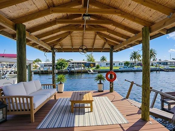 One or more photo(s) has been virtually staged. Boater's and Fisher's Dream Home! Looking for a 3-bed waterfront home in Leisure Beach with no HOA and true Gulf access? Welcome to 12612 4th Isle, a spacious, meticulously maintained, move-in-ready home with 3-bedrooms, 1.5-baths---offering 1,761 square feet of coastal living. Outside, enjoy 65 feet of seawall, a rare Solid-built, Permanently Covered Dock with 15 cement-filled Snap Jacket pilings, a floating dock, boat lift, and two motorized davits—an ideal setup for serious boaters and anglers. The maintenance-free, two-level concrete backyard is ideal for effortless outdoor entertainment, and the front and back screened porches are perfect for relaxing and taking in the coastal breeze. Inside, the large living room flows into a bright Florida room filled with natural light. The kitchen comes equipped with a complete set of appliances, ample counter space, and abundant cabinetry for storage. A spacious dining area offers room for hosting family and friends. All 3 bedrooms are well-sized, and the home has tile flooring throughout for easy maintenance and coastal durability. The layout offers flexibility for seasonal or full-time living, and the one-car garage with laundry hookups adds extra storage. The shoe-shaped driveway provides ample off-street parking for guests, and vehicles. The home has new plumbing throughout, Cross-linked Polyethylene (PEX) piping---warrantied until 2041 for long-lasting reliability and a wireless alarm system installed by Brink’s Home Security for peace of mind--upgrades include a 3-ton A/C system with all new ductwork in the attic, ensuring long-term comfort and efficiency. Located in a Canal community with no HOA, and just minutes to Hudson Beach, Waterfront dining, and Robert Strickland Memorial Park, this property delivers the full Florida lifestyle—on and off the water. See for yourself this stunning waterfront property !!