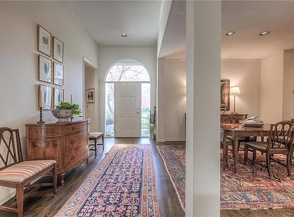 Lovely Leawood Villa in gated community. Large wall of windows with a spectacular view of the woods and creek. Meticulously maintained and showcased by a light & open f/plan, 11 ft. ceilings, dark hdwds, kit/hearth room with flagstone floor to ceiling fireplace, granite countertops with island, large mstr. & vaulted bath, second bedroom (or office) & utilities, all complement the first floor. A spacious w/o lower level includes fam. room, 2nd add'l bedroom & a full bath, cedar closet & unfinished bsmt for storage.