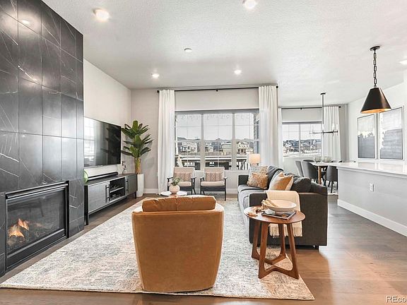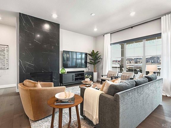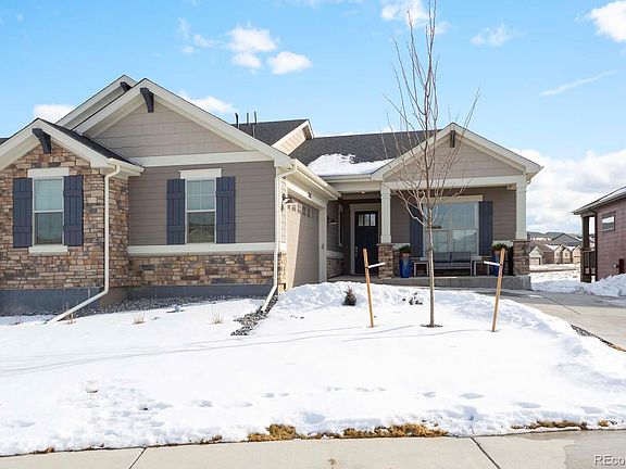 Built by Boulder Creek Neighborhoods, this gorgeous home is loaded with upgrades! Perfect for entertaining, the great room features premium engineered wood flooring and a stunning 10 foot, floor to ceiling, tile wrapped fireplace. Dining room is open to kitchen and great room and has access to the covered deck overlooking an expansive dry creek bed and walking paths. Gourmet kitchen boasts a large island with quartz countertops, matching slab backsplash and 42” cabinets. KitchenAid appliance package with gas range, ss hood and wall oven. Enjoy minimal steps in this lower maintenance ranch patio home that boasts 2 bedrooms on the main floor PLUS 2 bedrooms on the lower garden level as well as an oversized recreation room with built-in home theater system. Primary suite offers an elegant private bathroom dual sinks, heated tile floors, walk-in shower and large walk-in closet with access to main floor laundry. Upgraded tile and Shaw carpeting as well as designer light fixtures throughout. Custom drapes and rods, Hunter Douglas blinds with power blinds in great room and primary bedroom. Over-sized 2 car garage. Excellent location with walking paths, greenspaces and neighborhood park. Close to Riverdale Golf Course, Trail Winds Rec Center and convenient access to shopping and dining. Just 30 minutes to Boulder or Downtown Denver and 20 minutes to DIA!