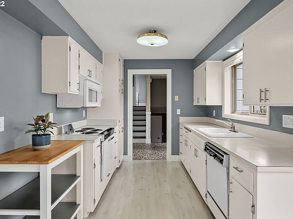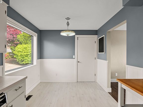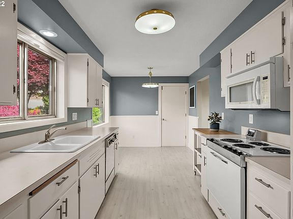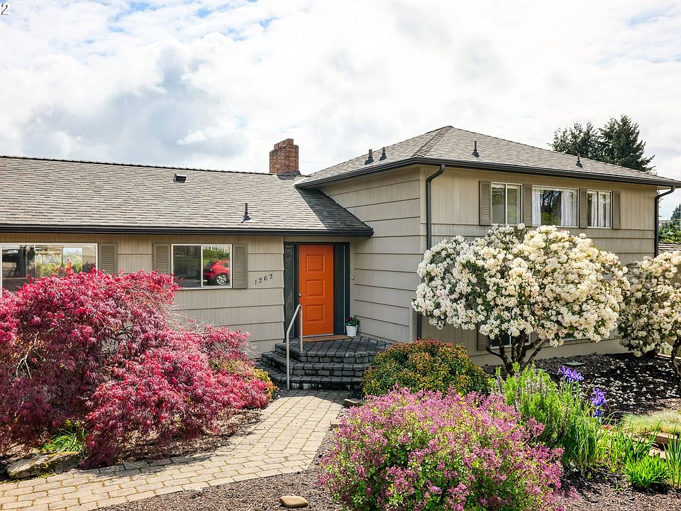 Beautiful mid-century modern home nestled on quiet cul-de-sac street sprawling almost 1/4 acre. Tasteful updates include new roof, interior paint, European oil finish on hardwood floors, sprinklers and more! Meticulously maintained yard includes raised beds for a gardeners dream. Designated work shop at the back of the garage offers ample space for projects. Look out across backyard onto open green space and the Cascade range with gorgeous views of Mt. Jefferson and Mt. Hood in the distance.