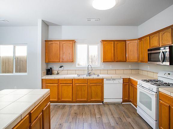 The kitchen is both bright and functional, with tile countertops, oak cabinets, and a breakfast bar that opens to the dining area—perfect for family meals and entertaining. The primary suite includes a private bath with dual sinks.