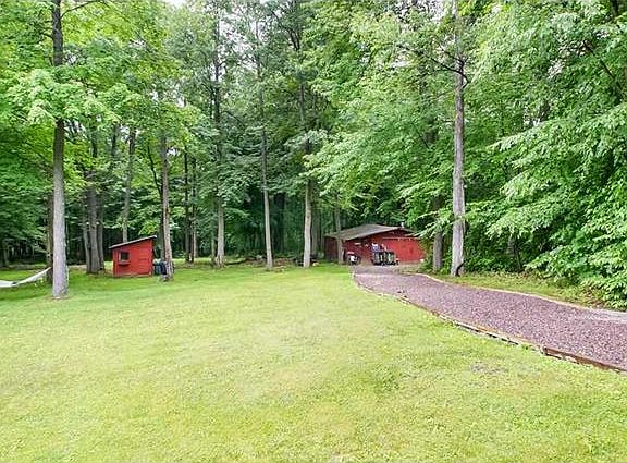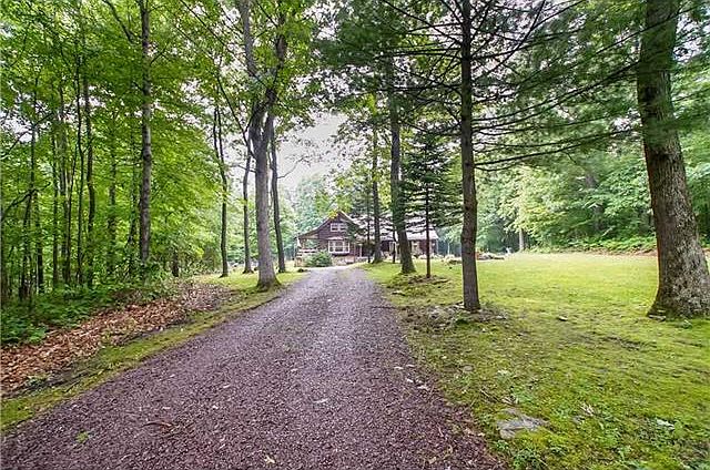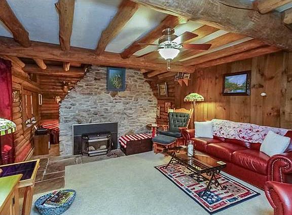 Gorgeous log cabin in a woodsy rustic 5+ acre setting! Local poplar and stone from the land was used to construct this fine home! Covered front porch with wrap around multi-level decks overlooking the tranquil grounds for an awesome retreat! Large eat-in kitchen with appliances, living and family rooms share the dual sided stone fireplace, one side w/pellet stove. ML and UL full baths, partially finished lower level with fireplace is perfect for a mancave or extra bedroom! Large garage with workshop, too!