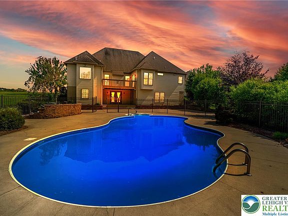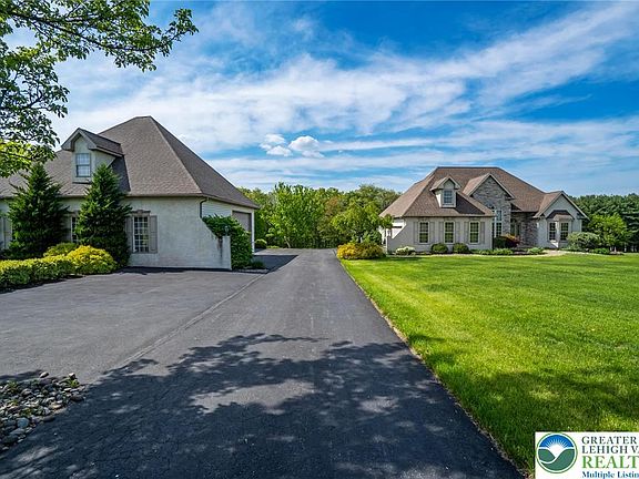 A Contemporary Retreat with Breathtaking Mountain Views! Nestled on a sprawling 1.79-acre lot, this stunning 5 BR, 3.5-bath contemporary home offers sweeping panoramic views and an exceptional layout perfect for both everyday living and entertaining. The main level showcases an open-concept design that seamlessly connects the living, family, and dining areas, all enhanced by vaulted ceilings, gleaming hardwood floors, a cozy propane stone FP, and an abundance of natural light through expansive windows. The kitchen is a chef’s dream, featuring Quartz countertops, a ceramic tile backsplash, SS appliances, and a charming breakfast nook that opens to a spacious deck overlooking the fenced-in, in-ground pool and patio—ideal for relaxing or hosting guests. The luxurious 1st floor primary suite boasts dual WICs, double vanities, a jetted soaking tub, and a large walk-in shower with dual shower heads. Upstairs, you’ll find a loft overlooking the family room, a dedicated office space, and a convenient powder room. The finished lower level offers a bonus family and recreation room complete with a built-in wet bar, full bathroom, and an additional BR—perfect for guests or extended living. Home Warranty included in sale! Additional features include a 2C attached garage, an oversized 4C detached garage with ample storage for vehicles and outdoor gear, and a prime location close to Route 443, Route 209, I-476, historic Jim Thorpe, and all the attractions of the Pocono Mountains.