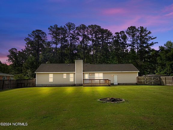 If you are looking for the perfect house to enjoy your time in NC, look no further. This 3 bedroom, 2 bath home with a 2 car garage sits on over an acre of land and is close to Camp Lejeune, MCAS New River, shopping, and the beach. Did I mention there is no HOA to worry about? Enter through the front door hallway into a spacious living area with a real wood burning fireplace. The living room opens up into the dining area and kitchen. The kitchen boasts granite countertops, subway tile backsplash, and a porcelain farmhouse sink. On the way to the other side of the home you will find the first full bathroom. The master suite has a walk in closet and its own bathroom. The other two bedrooms are also good sized with room to make them whatever your family needs. Step outside to enjoy the deck and expansive fenced in back yard perfect for entertaining, letting kids or pets run around or just privately enjoying the NC nights away from the hustle and bustle of Jacksonville. If you didn't think you could ask for more you were wrong. The roof was replaced in 2019, the HVAC in 2020, and the water heater in 2022. The washer and dryer even convey along with all of the appliances. We can't wait for you to step inside and fall in love with this home so set up a showing today!