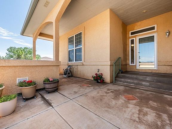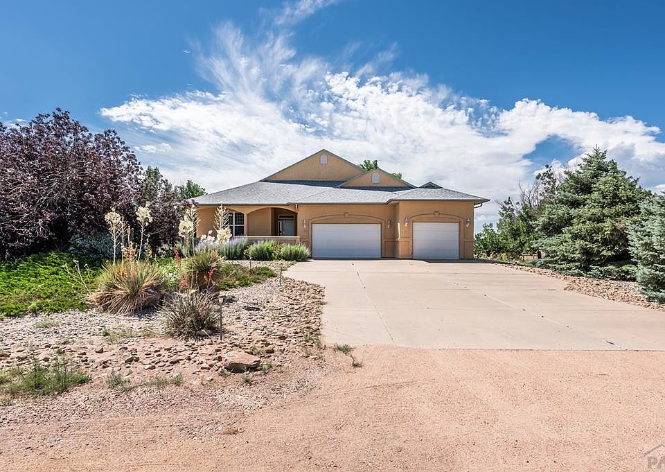 Take a look at this amazing Ranch style home on acreage with a lake view, close to schools and the reservoir. This home features 3 bedrooms and a flex room downstairs that could be a 4th non-conforming bedroom, hobby room, or workout room. Great open floor plan with formal dining room. The living room has a gas fireplace. The kitchen has tons of cabinet and counterspace, pantry, and large island. There is a spacious master bedroom with 5 piece bathroom including a jetted tub. There are great views of the mountains and lake from the kitchen nook, living room and primary bedroom, and large covered patio. The basement features one spacious bedroom, a flex room, full bath, and tons of storage. There is access to the garage from the basement for ease of moving large things to the basement. Enjoy the mature landscaping in the front and backyard from the large covered patios. Pikes Peak in the front and the Spanish Peaks out the back. There is also a 2 car detached garage with concrete floors and plenty of 220 outlets. Also rough in for a half bath. This home has many additional features such as central air (new 2023), 2x6 construction on the home and extra garage, radon mitigation system, whole house fan, plugs on the eves for lights, LED lighting in and out and so much more.