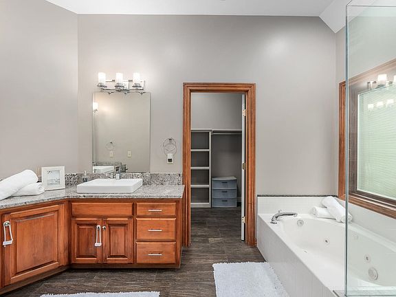 Beautiful, well cared for patio home in White Tail! This one has it all. Beautiful wood flooring, solid surface counters, split bedroom plan, spacious rooms and more. Lots of great space for entertaining. Master ensuite features large bathroom with separate vanities, large walk in shower and separate tub. The hearth kitchen is very open and features stainless appliances, island, built in desk and plenty of cabinetry. The master closet is an oversized walk in. Large windows give this home natural light throughout. Full finished walk out basement, treed yard with sprinkler system. Wheatland Elementary and Andover Middle and High School.