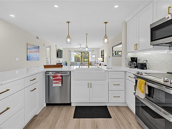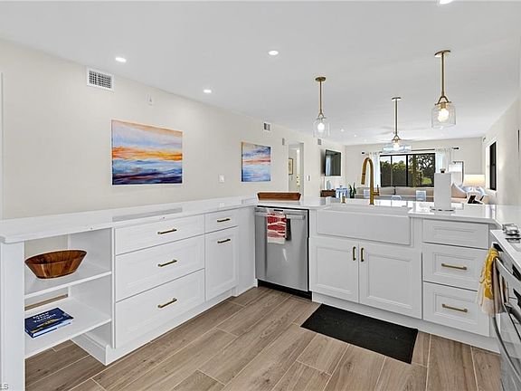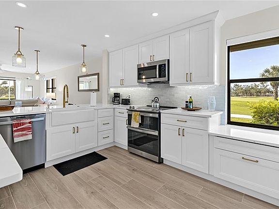 Completely Renovated, First Floor Corner 2 Bedroom, 2 Bathroom, Comfortably Sleeps 6 Welcome to Kelly Greens Golf and Country Club where this uniquely situated condo unit is brand new and ready for YOU! This main floor unit has recently been beautifully updated. The main living space has an open floor plan, featuring tile flooring throughout, quartz countertops, stainless steel appliances, recessed lighting, and an abundance of natural light throughout the day! Enjoy watching the sunrise with your morning coffee, the unobstructed lake and golf course views, the golfers passing by as well as the magnificent wildlife all while sitting on the newly furnished lanai. Relax after a day of golf or exploring all that Florida s coast has to offer in your cozy living room that has plenty of seating, and a stylish TV console. If you love to cook and entertain, you will appreciate the open kitchen that is fully equipped to make all your meals look and taste delicious. We ve provided your spacious dining table with lovely placemats and hurricane lamps to set the mood for all occasions. We haven t forgotten how important it is to get a good night sleep. All the beds are outfitted with crisp white, 100% cotton percale linens, down pillows, down duvets, and extra thick mattress pads. It s like sleeping on a cloud! And the brand-new bathrooms have beautiful tile, quartz counters, and stylish cabinets. All towels, shower curtains, bathmats, and wall d cor have been selected with great care to evoke a serene, comfortable setting. The club house is a very short walk away and offers a lovely menu, drinks along with wonderful service. There is a fitness center, Community pool and Terraces Condo neighborhood pool/spa. This community is filled with wonderful neighbors and there is always something to participate in yet no obligation to do so. We hope that you enjoy your stay in our beautiful Florida home. We focused our complete renovation project on quality finishes, classic, timeless furnishings, and pleasing d cor making sure that you, our guest, will be surrounded by beauty, style and convenience while vacationing in the stunning grounds of Kelly Greens.