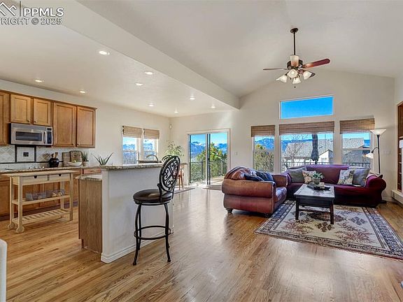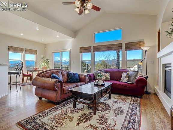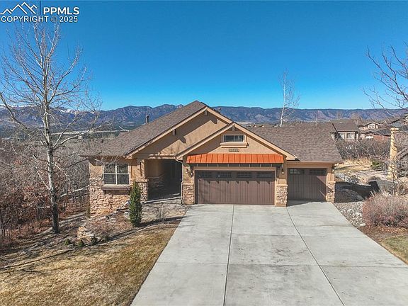 Luxury living in Stone Crossing w/panoramic views nestled on .29-acre lot. Offering mature landscape w/private spaces to relax outdoors. Walk to Mary Kary Park/playground, D-20 Da Vinci Academy, community walking trails w/creek/pond & more. When you step inside, you'll be captivated by the impressive level of craftsmanship & attn to details. New interior paint & all new carpet throughout. The great rm boasts vaulted ceilings, gas fireplace, built-in bookshelves, solid oak hardwd flrs that flow throughout & wall of glass capturing views of Pikes Peak. Formal dining space has custom cabinets w/serving counter, arched entry, tray ceiling & easy access to the kitchen. The gourmet eat-in kitchen has solid maple cabinets w/ pantry, range top, double wall mounted ovens, expansive granite counters, island w/breakfast bar & can lighting. The adj dining nook offers a large space to entertain surrounded by views of the mountains. From here walk out to the huge like new composite deck w/metal railing & balusters & access to the manicured backyard w/scrub oak & stream/pond water feature. The main lvl primary suite has a bay window/sitting area, new plush carpet, tiered tray ceiling, 3-sided fireplace, walk-in closet & adj spa like bathrm. The 5pc primary bath offers travertine tile flr, large dble vanity, & a jetted tub near the fireplace. Main level bedrm/office has updated lighting & nearby full bath w/tile flr.Head down to the finished walk-out basement boasting an open family rm w/ fireplace, built-ins, wet bar & extra cabinets for storage. A nearby flex room is great for work-out space or crafting. 1 of the 2 lower lvl beds has a walk-in closet while the other has garden level windows letting the light pour in. Both have easy access to the hall bath. Incredible main lvl laundry/mud rm w/newer luxury vinyl plank flr, sink, cabinets/shelves & seating creating a functional drop zone. This home offers all the modern amenities min from D20 schools, shopping, USAFA, & I-25.