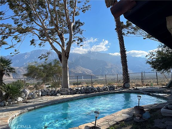 A home on a large private corner lot with great views of mountains. A nice pool that has a spa attached that faces southeast towards the San Jacinto Mountain. This home has three bedrooms and two bathrooms. The large master bathroom will need to be remodeled with your own decor after the close of escrow. Enter into a good size living room with a brick fireplace, tile floors, with a nice size office space that has been added. The master bedroom has double doors, walk-in closet and a sliding glass door out to the pool area. Kitchen has lots of cabinets with stylish tile flooring. Low maintenance landscaping with some fruit and palm trees. There is a large, finished garage, lots of parking that has space for a RV, newer 6-ton AC, tile roof, tankless water heater, a large, cemented area to entertain guest or possible add another unit. A home you will want to view here soon with lots of possibilities. More pictures to come soon.