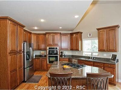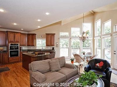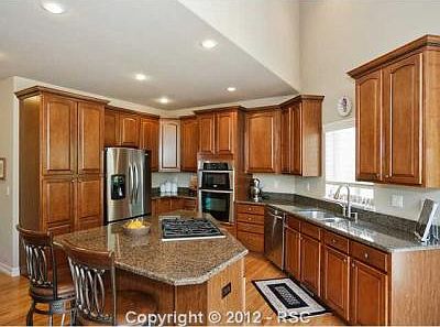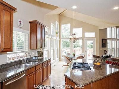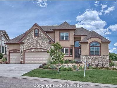 TRUE MAIN LEVEL LIVING IN THIS IMMACULATE SEMI-CUSTOM 2-STORY IN STONE CROSSING w/SUPERB CURB APPEAL ~ LARGE MASTER SUITE ON MAIN w/5-PIECE BATH & FIREPLACE ~ 20+' CEILINGS IN GREAT ROOM ~ GOURMET KITCHEN W/SLAB COUNTERS, CHERRY CABINETRY, GAS COOK TOP, SS APPLIANCES ~ LARGE ISLAND & LOVELY FIREPLACE HEARTH AREA ~ GLEAMING HARDWOODS ~ WALLS OF WINDOWS TOWARDS REAR PRIVATE TREX DECK ~ FORMAL DINING ~ OFFICE ON MAIN ~ HUGE REC ROOM IN BASEMENT w/WET BAR & BED w/FULL BATH & STORAGE ROOM ~ VIEWS-VIEWS OF MOUNTAINS & USAFA!