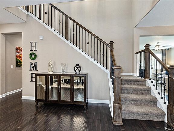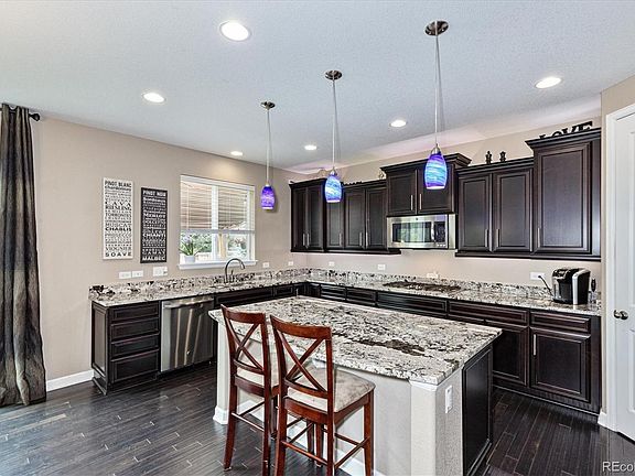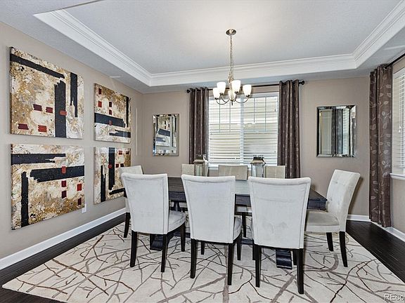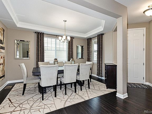 Move in ready beauty in Peoria Place features 4200 finished square feet, offering 4 bedrooms upstairs and a loft, plus a main floor study/5th bedroom and builder finished basement! You'll notice the handsome curb appeal with manicured lawn, covered front porch, concrete tile roof and a 3 car side by side garage. Welcome inside to hardwood floors, 8' doors on the main level, a neutral color palette and upgraded lighting. Gourmet kitchen boasts staggered espresso cabinets with crown molding and under cabinet lighting. Large island is perfect for prep or entertaining with seating space. Stunning slab granite countertops coordinate perfectly with the stainless steel appliances that include gas cooktop, microwave, dishwasher and refrigerator. Note the roll out shelves at the island cabinets and walk-in pantry for storage. Generous great room features a relaxing ambiance with upgraded carpet, Stainmaster pad with moisture barrier and a gas fireplace. Access the privacy fenced backyard and imagine relaxing on the patio with firepit and pergola. Garden boxes are waiting for you to plant! The main floor is complete with a formal dining room, powder room and mud room closet. Notice the wrought iron at the stairs as you ascend to the loft that is waiting for your needs: could be additional living space, work from home or learning. Master suite boasts a five piece bath and two walk-in closets! Secondary bedrooms utilize the full hall bath and laundry is favorably located upstairs. Finished basement with 9' ceiling features an oversized rec room that has so many possibilities for media, games or workout, complete with access to the 3/4 bath with tile floors and another bedroom. This home has dual zone heat and air for comfort and efficiency. Conveniently located off of Lincoln and Peoria in the Douglas County School District, you'll love being just minutes from I25, DTC, shopping and restaurants!