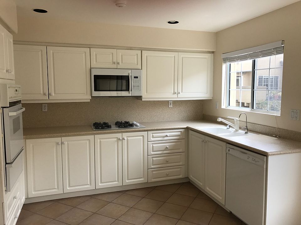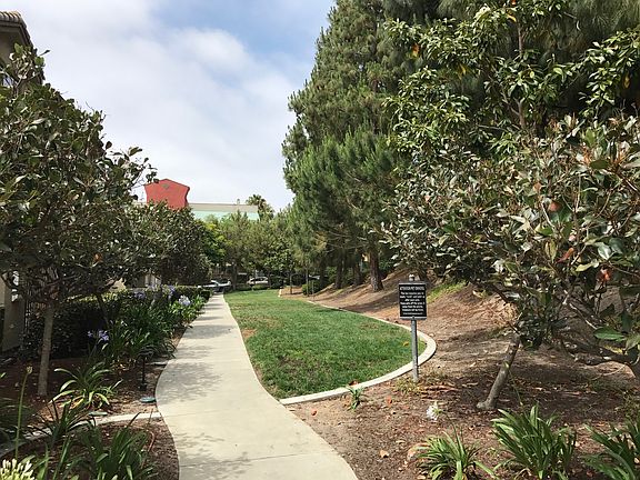 Lovely quiet unit with spacious tiled patio facing greenbelt with parklike views. Light and bright kitchen with solid surface counter tops, new refrigerator, newer microwave, tile floors and balcony. Open floor plan with wood floors in dining room and living room with soaring ceiling. Central Vac, washer/dryer and refrigerator included. 2 car garage with extra large storage area. Large pool and work out room. Walk to everything, restaurants, shopping schools. Quick freeway access to 5 and 56.