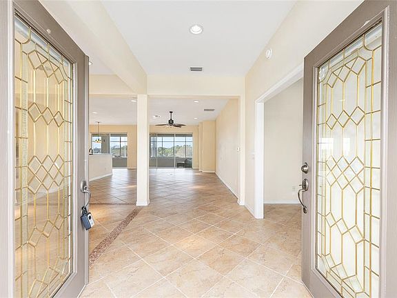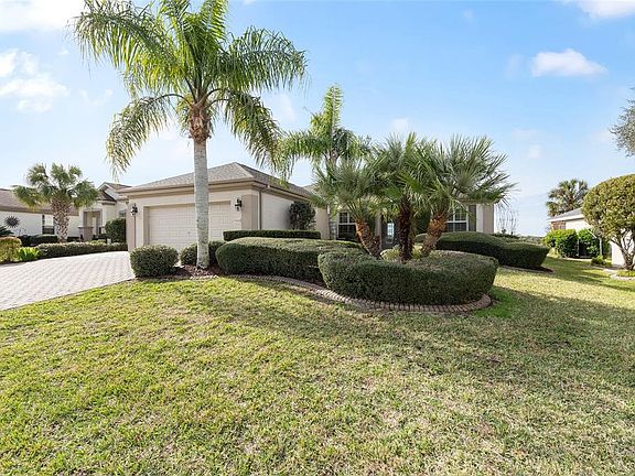 This distinguished Johnstown model features remarkable sunsets and picturesque golf course views. The property is introduced by a paver driveway and walkway leading to elegant double-beveled doors. Diagonal-set tile flooring extends through the main living areas and office, while the bedrooms offer the comfort of carpeting. The kitchen boasts quartz countertops, a stone backsplash, cabinet pull-outs, and stainless-steel appliances. The home has Plantation Shutters on the front of the home….. the back windows are open for the beautiful views! Each bedroom includes ceiling fans for enhanced comfort. The spacious 10’ x 10’ laundry room is equipped with upper and lower cabinetry along one wall, and additional cabinets above the washer and dryer provide ample storage. A 4’ extended garage offers extra space, including an integrated golf cart bay, slop sink, and overhead automatic garage screen system. Additional features include an irrigation water filter, a GENERAC generator (transfer “As Is”), and a private irrigation well. The roof was newly installed in 2021. Residents can enjoy the expansive 37’ x 10’ enclosed lanai with ceiling fans, opening onto a screened birdcage—ideal for relaxation and enjoying Florida’s sunsets. Located within Del Webb’s Spruce Creek Golf & Country Club in Summerfield, this home provides access to premier amenities, including over 70 clubs, three pools and hot tubs, a state-of-the-art fitness center, pickleball and tennis courts, four nine-hole golf courses, and more. The seller is offering a one-year Broward Factory Service Home Warranty. *Some photos have been virtually staged.*