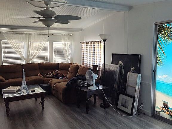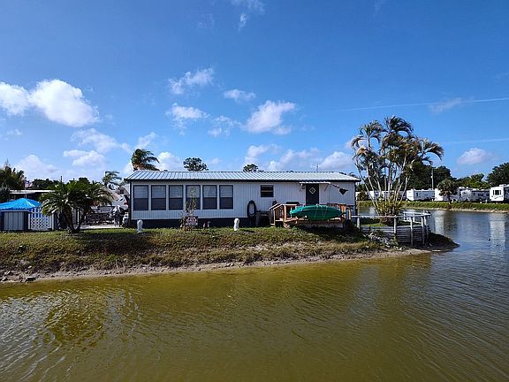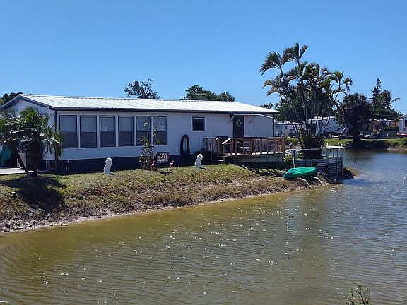 Welcome home. This 2-bedroom 2-bath mobile home is freshly remodeled both inside and out to allow you to just move in and enjoy. It’s located in Lazy J’s Mobile Home and RV Park which features the most reasonable monthly lot rent in SW Florida at 416.00. Please note that Lazy J's is a 55+ community requiring a successful background check for residency. This lot has 2 sides water views and is at the end of the road limiting foot and vehicle traffic. It is just across the bridge from the clubhouse, park office and mail boxes. The exterior features include a new metal roof, fresh paint on all exteriors walls, a new large deck off of the kitchen area, 3 parking places, An 9' x 11' air-conditioned shop with 2 dedicated electrical circuits, A 4' x 6' garden shack, 2 exterior separate dedicated electrical circuits, Full security camera system that continuously records all exterior areas with remote viewing to your phone. Special feature for this home is a rebuilt reinforced roof system all along the exterior of the home to minimize the effects of any storm system to include safety covers for all windows. The interior features include upgraded water heater to 40 gallons, 3-year-old central a/c and heating system, replumb of water pipes to PEX style piping, garbage disposal, dishwasher, inside laundry room, all new ceilings upgraded using plywood bead board materials, entire ceiling insulation removed and replaced with new insulation, fresh white paint on all walls and ceilings, has both a tub/shower and a shower for bathing, new luxury vinyl flooring throughout the home, kitchen has a food prep island with a overhead pan and accessory rack (installed with a lighting effects system), 75” tv in front room (also installed with a lighting effects system). Items included with this sale 2000 club car golf cart, all furniture in the home (notably the 75” tv in the front room, the security system and 50” tv with it), queen bed room, office desk, Microwave/Air Fryer/Convectional oven unit, washer and dryer, Tables and chairs both in the home and on the property will also be staying, some shop tools plus more. Don't let this one slip by. This home was crafted to stand up to Florida's weather while appealing to Florida's care free lifestyle and not just readied for sale. Please contact Scott at 720 422-2005 owner/seller for more information and to set up a viewing of this home. *please note * this is a mobile home for sale located in a mobile home community park that rents lots to mobile home owners.