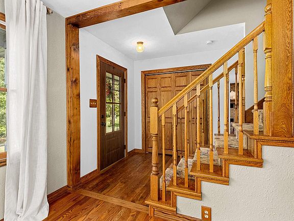 Nestled on 7 wooded acres, this 3-bedroom, 2.5-bath home offers the perfect balance of privacy and convenience, just minutes from grocery store and amenities. Oak hardwood floors run throughout the main level, where the kitchen and dining area, featuring a wood-burning fireplace, opens to a bright family room with vaulted ceilings, large windows, and a masonry brick accent wall. The stunning, updated kitchen boasts custom cabinetry, quartz countertops, a farmhouse sink, and a beautiful backsplash. The main level also includes a living room, a mudroom, and a half bath. Upstairs, the spacious primary suite offers a private bath with a walk-in tiled shower, while the second bath features a walk-in tile shower and oversized whirlpool tub. The finished lower level provides extra living space with a family room, office, and storage room. Outside, enjoy the above-ground pool with a cedar deck and a versatile 24x32 barn/outbuilding with power, perfect for parking cars, boats, or converting into a horse stable. The upstairs of the outbuilding offers living space/office area with a full bath. A whole-house generator ensures peace of mind year-round. Don't miss this one-of-a-kind property!