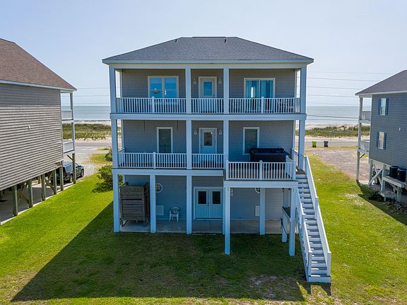 This is a rare opportunity to own a 5 bedroom home with unobstructed views of the ocean and with a dock with 2 1500 lb. jet ski lifts. The 3 stop elevator makes getting up and down easy. Wake up in the morning and watch the sunrise over the Atlantic ocean. Then, go the back of the home and watch the sunset over the ICW and marsh lands. Four decks run the length of the home, two on the ocean side and two on the ICW side. All 5 bedrooms have direct access to the ocean views or sound/ICW views from your private deck access. The 4 bedrooms on the first floor share 2 jack-n-jill bathrooms. The top floor master suite is off the living room and features a large bathroom and private ocean view access. There is a bonus room over the living room on the 3rd floor. Did I mention the hot tub and that the beach access is just across the street? Also, each floor has a washer and dryer. Seller replaced the roof in 2018, heat pumps in 2019 and vinyl railings in 2019. The lot is over 3/4 of an acre. This property has not been a rental.