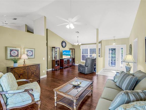 GOLF MEMBERSHIP INCLUDED ($50,000 value)! Perfectly situated in one of the most desirable locations in Hunters Ridge, this fantastic, nicely furnished, two-bedroom plus den, 2 ½ bath single-family pool home offers comfort, style, and one of the best views in the community. A welcoming courtyard entry sets the stage for this home. Inside, the primary suite provides privacy with its own bath, the spacious guest bedroom is ideal for family or visitors, and the versatile den can easily serve as a third bedroom, office, or hobby room. The kitchen stands out with granite countertops, stainless-steel appliances, and abundant cabinet and counter space. Additional updates include a newer A/C system, water heater, and pool heater, making this home move-in ready and easy to enjoy. The expansive lanai with a large sparkling pool creates the ultimate outdoor retreat, complete with electric roll-down hurricane shutters, while all other windows feature manual shutters for added protection and peace of mind. From this private space, enjoy sweeping lake and fountain views framed by the picturesque backdrop of the golf course, truly one of the most sought-after settings in the community. A two-car attached garage with golf cart entry adds convenience and functionality. Hunters Ridge is a private Golf & Country Club, not a bundled community. With only 420 golf members and no Chelsea system, golf enthusiasts enjoy the freedom to play as often as they like. The Club is known for its welcoming, relaxed atmosphere and offers a vibrant calendar of social and golf activities. Only six miles from Barefoot Beach Preserve, Hunters Ridge provides quick access to premier shopping, dining, entertainment, and RSW Airport. Within the community, residents enjoy an 18-hole championship golf course, state-of-the-art golf simulators, a spacious resort style pool with food and beverage service, tennis courts, pickleball courts, and much more. The clubhouse features both elegant dining and a casual grill room. Adding to the lifestyle appeal, a major renovation is currently underway. The Activity and Fitness Center is being transformed into a modern, updated Community Center with expanded fitness and wellness amenities an exciting enhancement that will elevate daily living, increase home values, and truly bring resort style wellness to your doorstep. Don’t miss the opportunity to experience the exceptional lifestyle of Hunters Ridge.